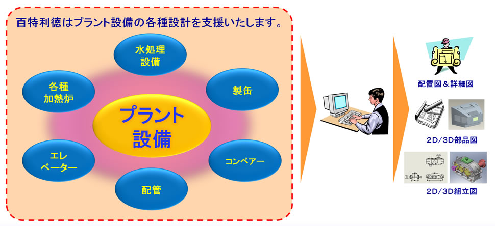 主に各種プラント機械設備の設計業務を受託しております。各種CADを駆使し、自動車部品の熱処理設備、エレベーター、水処理設備等の設計?作図業務を行っております。