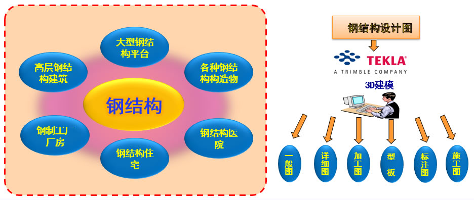 我們使用TEKLA,AUTOCAD等軟件,為客戶提供鋼結構的設計圖(計劃圖,構造圖)及設計檢查用的圖面,以及加工工廠用的加工圖,裝配圖等設計工作。