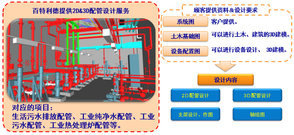 根據(jù)客戶提供的相關資料、 我們利用PLANT 3D 、 AUTOCAD 、 REVIT等多種軟件進行工業(yè)配管設計 及制圖服務。