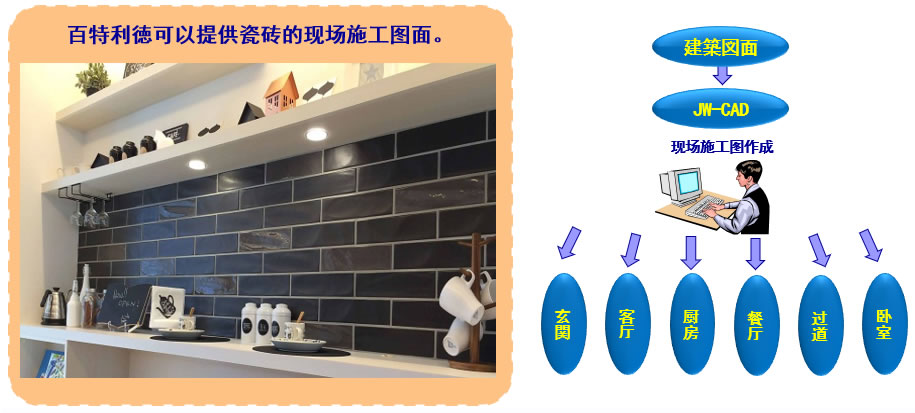 對新建一戶建的玄關,廚房等需要瓷磚設計的地方,用JWCAD來做成瓷磚的現場施工圖。